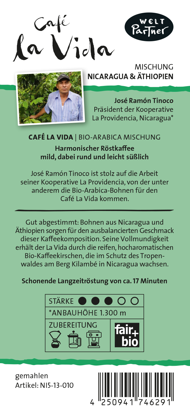 Eine gut abgestimmte Mischung von Bohnen aus Nicaragua und Äthiopien sorgt für den ausbalancierten Geschmack des „La Vida“. Seine Vollmundigkeit erhält er durch die vollreifen, hocharomatischen Bio-Kaffeekirschen, die im Schutz des Tropenwaldes am Berg Kilambé in Nicaragua wachsen. Die Kleinbauern der Kooperative La Providencia ernten und verlesen sie von Hand. Sie sind stolz, Teil des Fairen Handels zu sein.