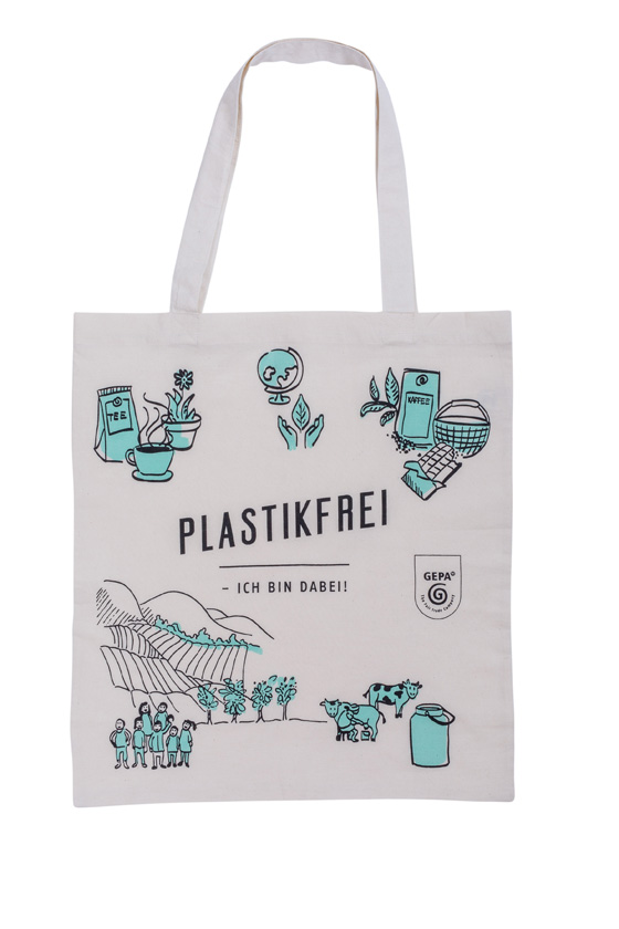 Setze ein Zeichen mit Deiner Einkaufstasche. Immer dabei, auch für den Verzicht auf Papiertaschen. Die Stofftasche ist aus hochwertiger Bio-Baumwolle, handbedruckt mit dem Slogan "Plastikfrei - ich bin dabei!". Sie ist im Hochformat mit langem Henkel. Klein gefaltet in der Handtasche ist sie immer griffbereit, damit Du niemals mehr im Laden eine neue Tüte kaufen musst. So kannst Du gezielt auf unnötiges Plastik verzichten und hilfst dabei der Umwelt. Die GEPA erhält diese Einkaufstaschen von Ihrem Partner CRC in Indien.