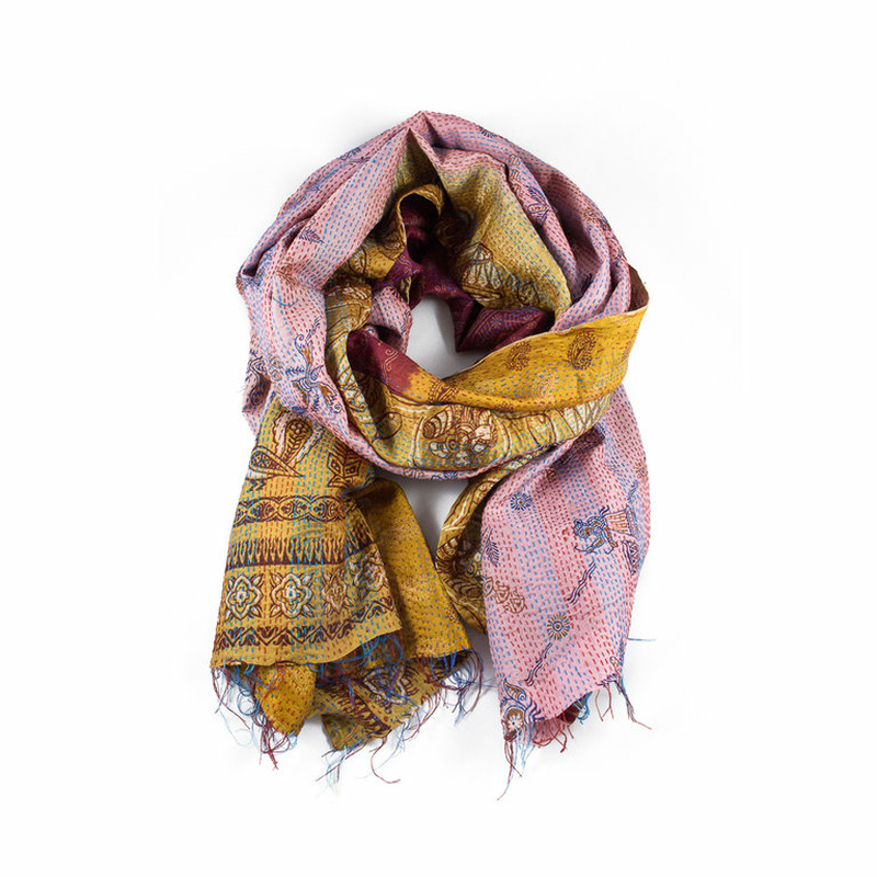 Diese Schals sind aus recycelten Seidensaris hergestellt. Zwei oder mehrere Saris werden durch aufwändige Handstickerei (mit dem sogenannten "Kantha-Stich") zusammengefügt. Die Schals haben unterschiedliche Motive auf beiden Seiten und können somit beidseitig in verschiedenen Looks getragen werden.