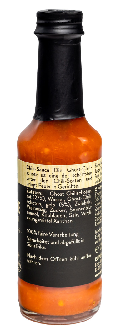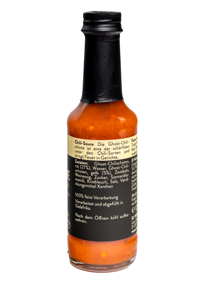 Ghost-Chilischoten, rot (27%), Wasser, Ghost-Chilischoten, gelb (5%), Zwiebeln, Weinessig, Zucker, Sonnenblumenöl, Knoblauch, Salz, Verdickungsmittel Xanthan