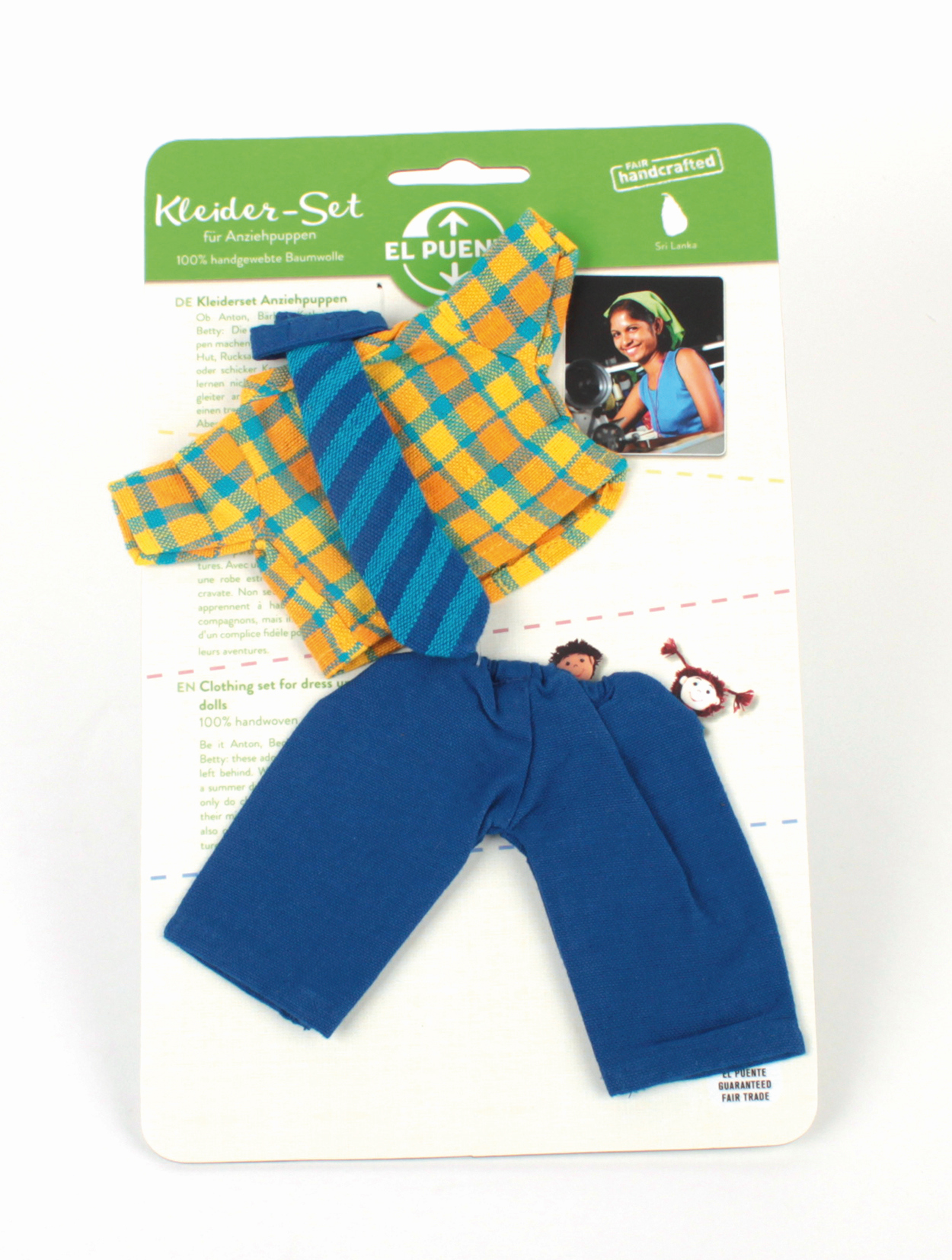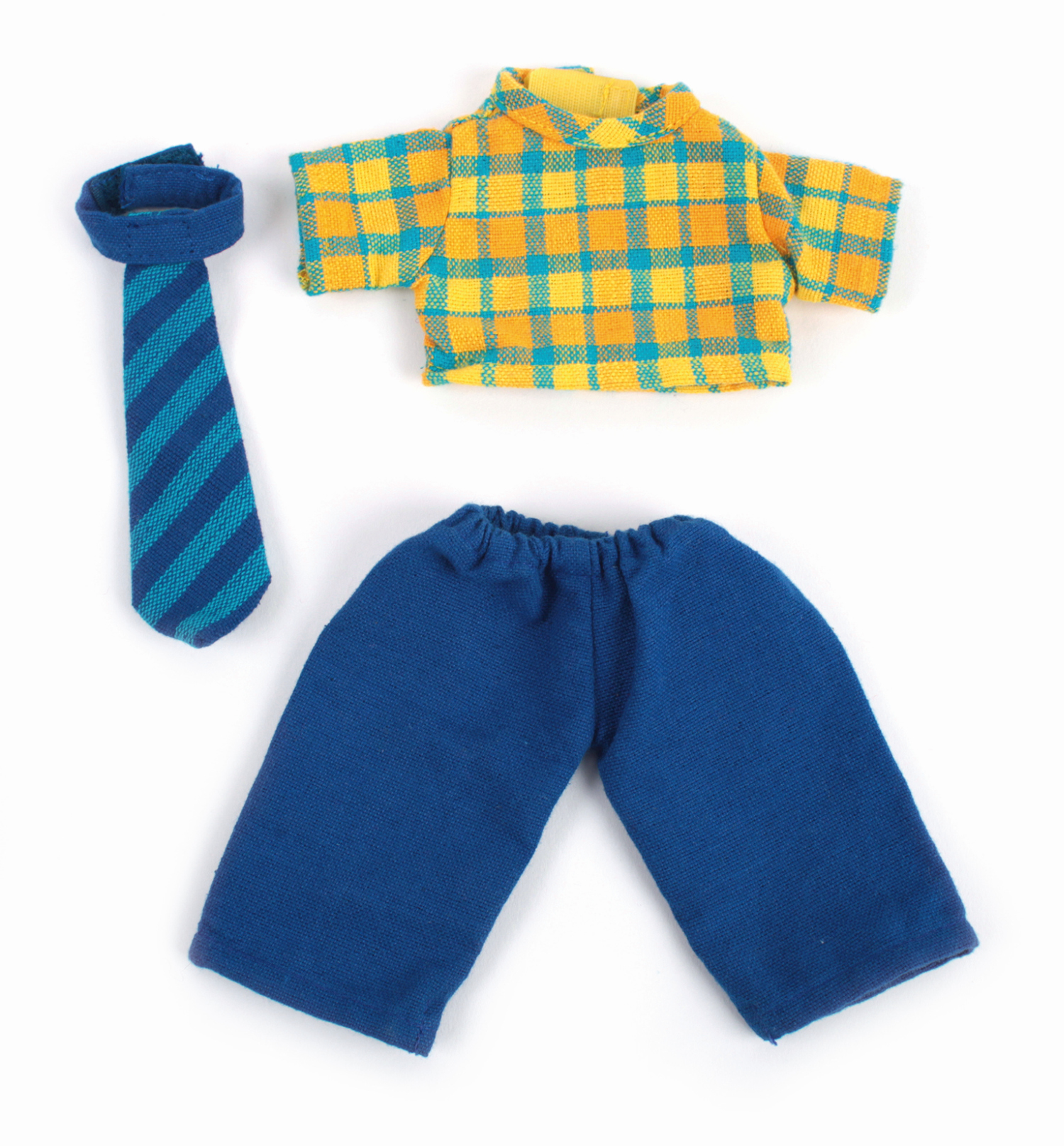 100% handgewebte Baumwolle, 3-teilig,, blau/gelb, Hemd 14 x 8 cm, Hose 12,5 x 12 cm,, Krawatte L 10 cm