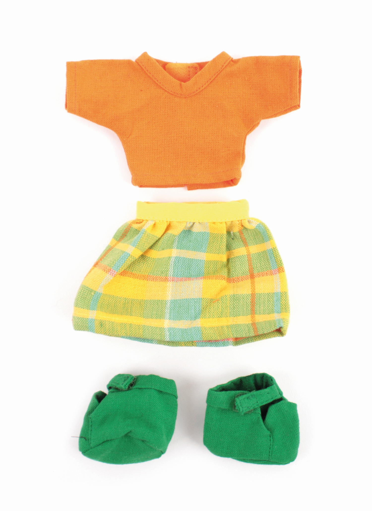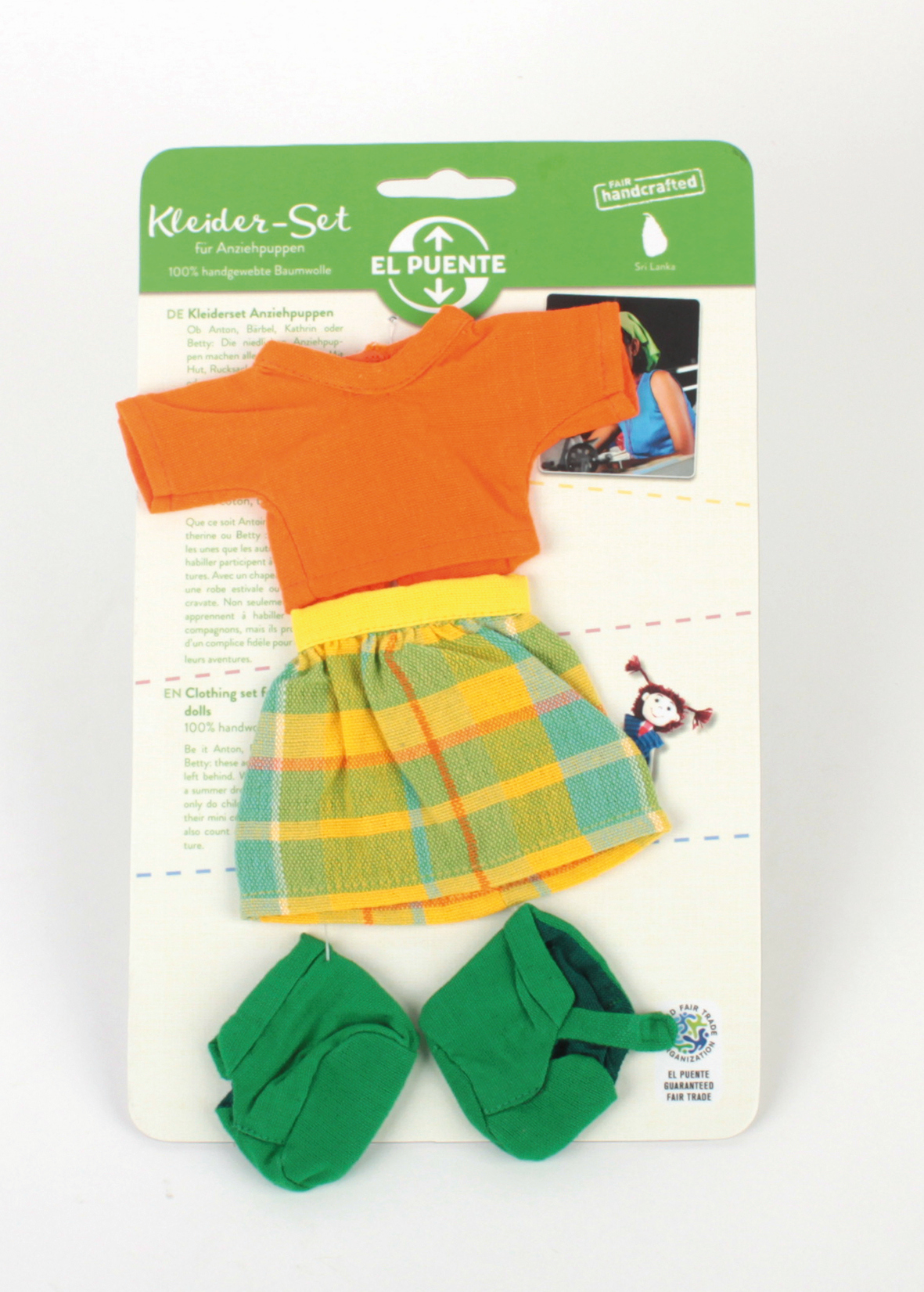 100% handgewebte Baumwolle, 4-teilig,, orange/gelb/grün, T-Shirt 14 x 7,5 cm,, Rock 12 x 9 cm, Schuhe 6 x 4,5 cm