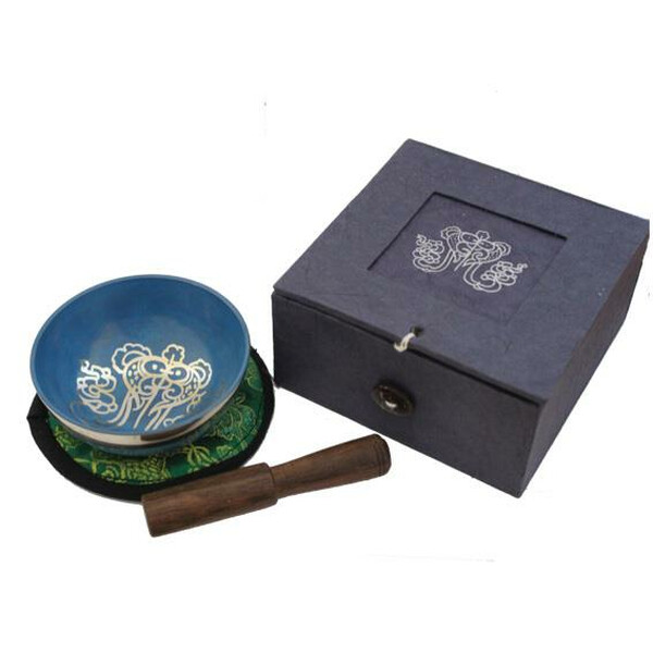 Gegossene farbige Klangschale, graviert mit buddhistischem Glückssymbol "Fischpaar", komplett mit Mini-Klöppel und Untersetzer in dekorativer Geschenkbox aus handgeschöpftem Nepalpapier.