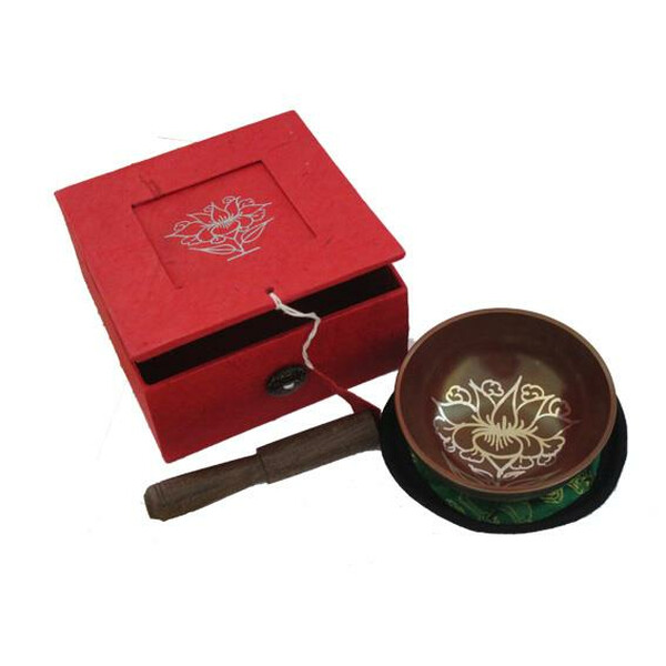 Gegossene farbige Klangschale, graviert mit buddhistischem Glückssymbol "Lotosblume", komplett mit Mini-Klöppel und Untersetzer in dekorativer Geschenkbox aus handgeschöpftem Nepalpapier.