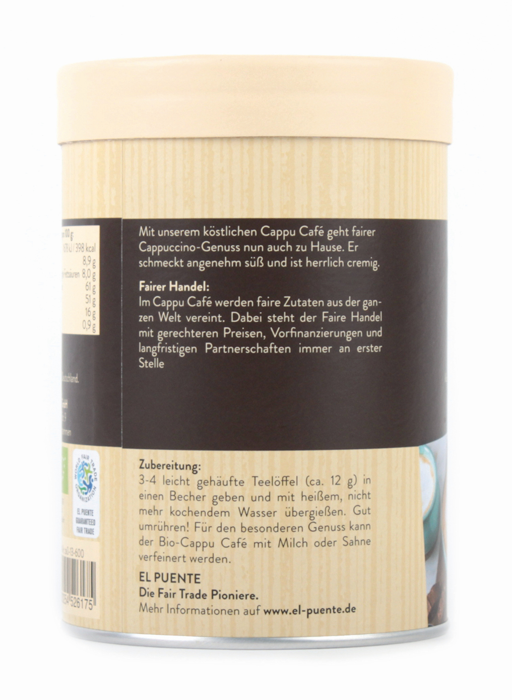 Unser klassischer, cremiger Instant- Cappuccino für den schnellen Kaffee-Genuss. Leicht gesüßt mit Rohrohrzucker.
