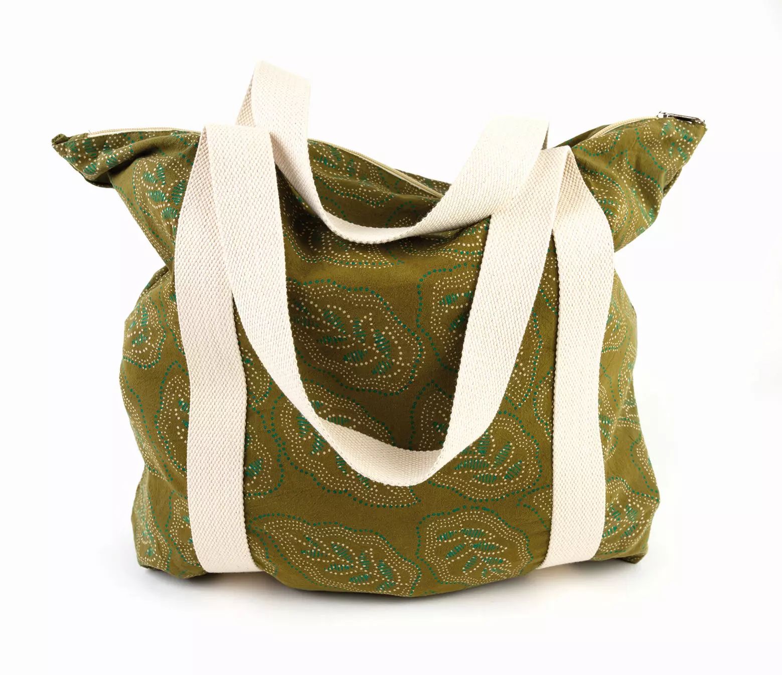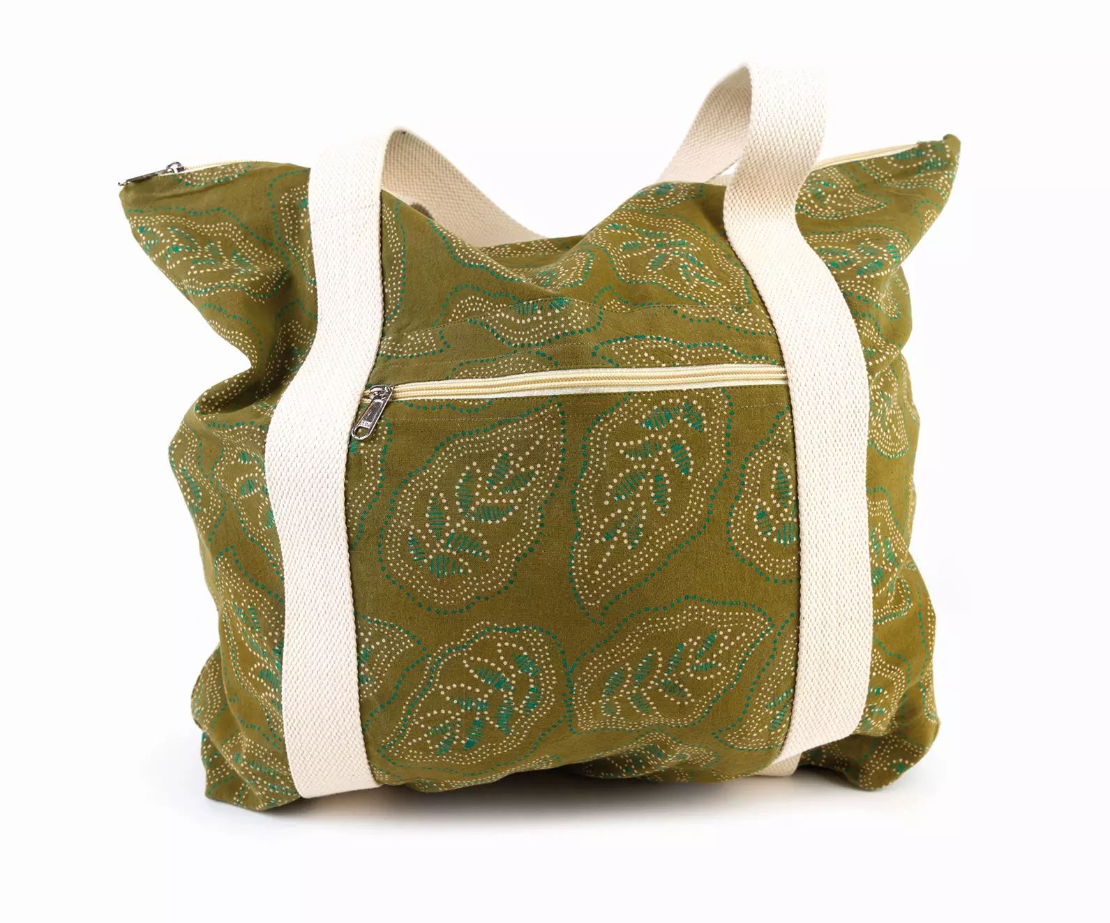 100% Baumwolle, mit Reißverschlusstasche außen,, grün/naturweiß, mit Blattmuster,, 50 x 45 cm, Griff 70 cm,