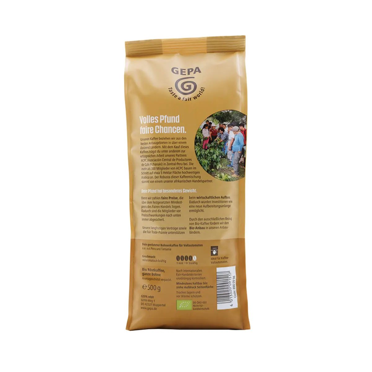 Aus so unterschiedlichen Heimatländern wie Tansania, Uganda, Nicaragua und Peru entsteht eine ausgewogene, kräftige Bio Kaffee-Mischung – optimal als Crema-Kaffee. Probieren Sie dazu ein Stückchen GEPA Fair Trade Schokolade und erleben Sie Genuss pur.