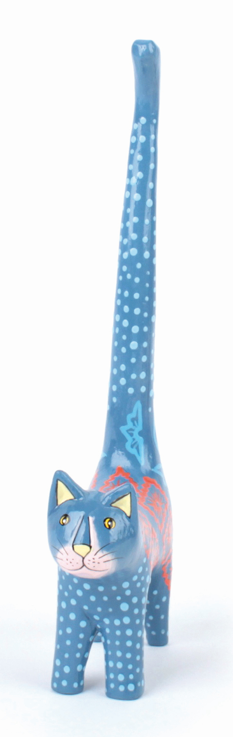 Albesia-Holz, Katze mit langem Schwanz, blau mit bunter Verzierung, 8 x 21 cm