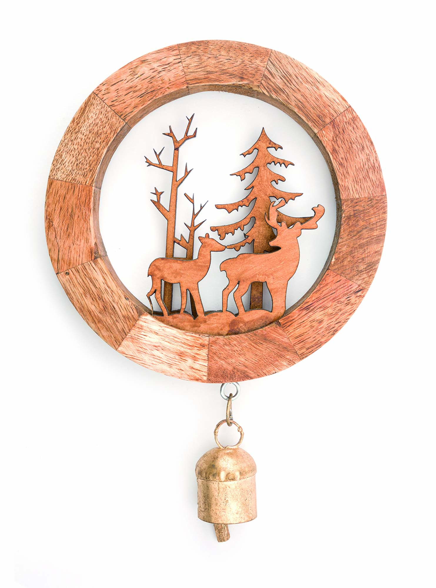 Mango-Holz, Glöckchen aus recyceltem Eisen, mit Aufhängung auf Rückseite, 14 x 22 cm
