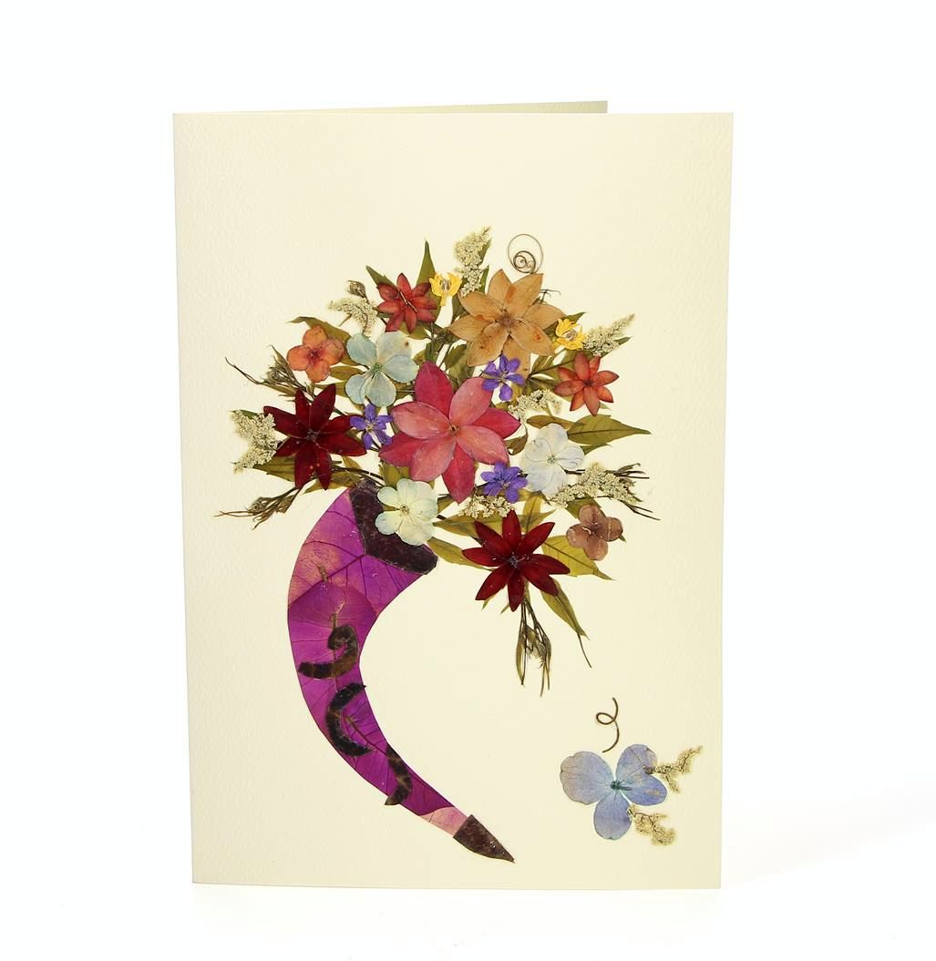 Diese Karte wurde in Comasagua, El Salvador von Hand gefertigt. In unserer Partnerwerkstatt arbeiten ca. 20 Frauen, die mit der Herstellung der Karten ihre Familien unterstützen. Sie sammeln alle verwendeten Pflanzenteile selbst, trocknen sie in alten Telefonbüchern und gestalten die filigranen Blütenbilder.