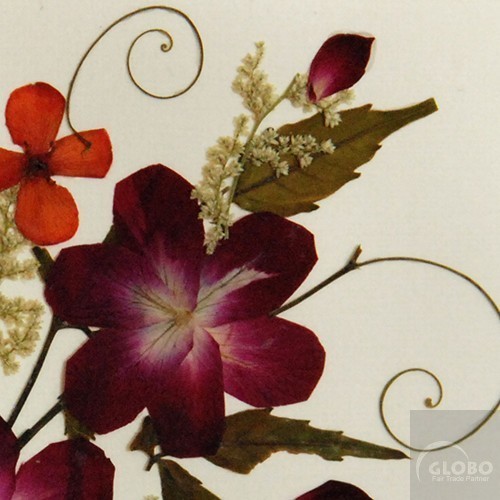 Diese Karte wurde in Comasagua, El Salvador von Hand gefertigt. In unserer Partnerwerkstatt arbeiten ca. 20 Frauen, die mit der Herstellung der Karten ihre Familien unterstützen. Sie sammeln alle verwendeten Pflanzenteile selbst, trocknen sie in alten Telefonbüchern und gestalten die filigranen Blütenbilder.