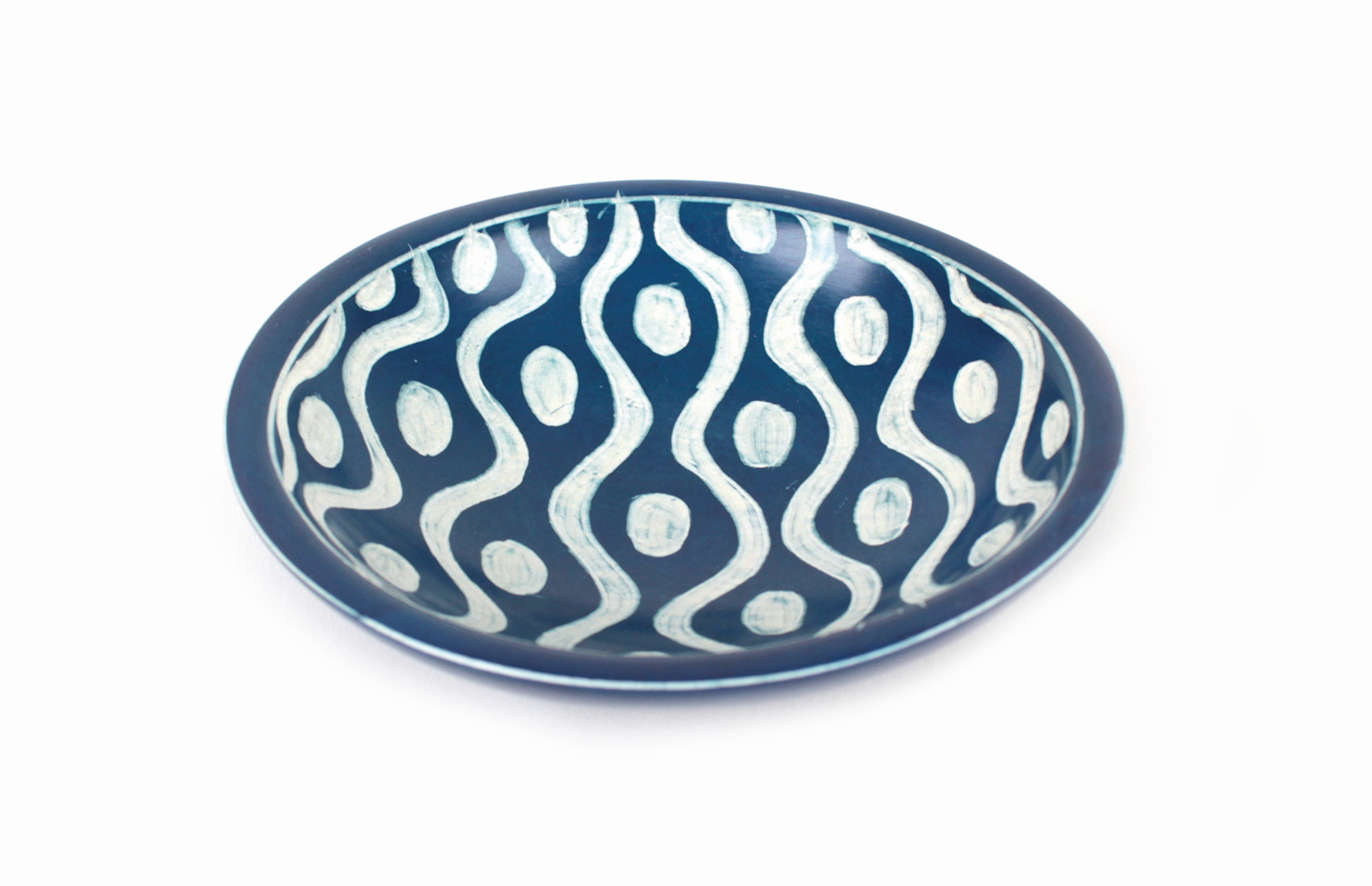 rund, blau mit weißen Wellen und Punkten,