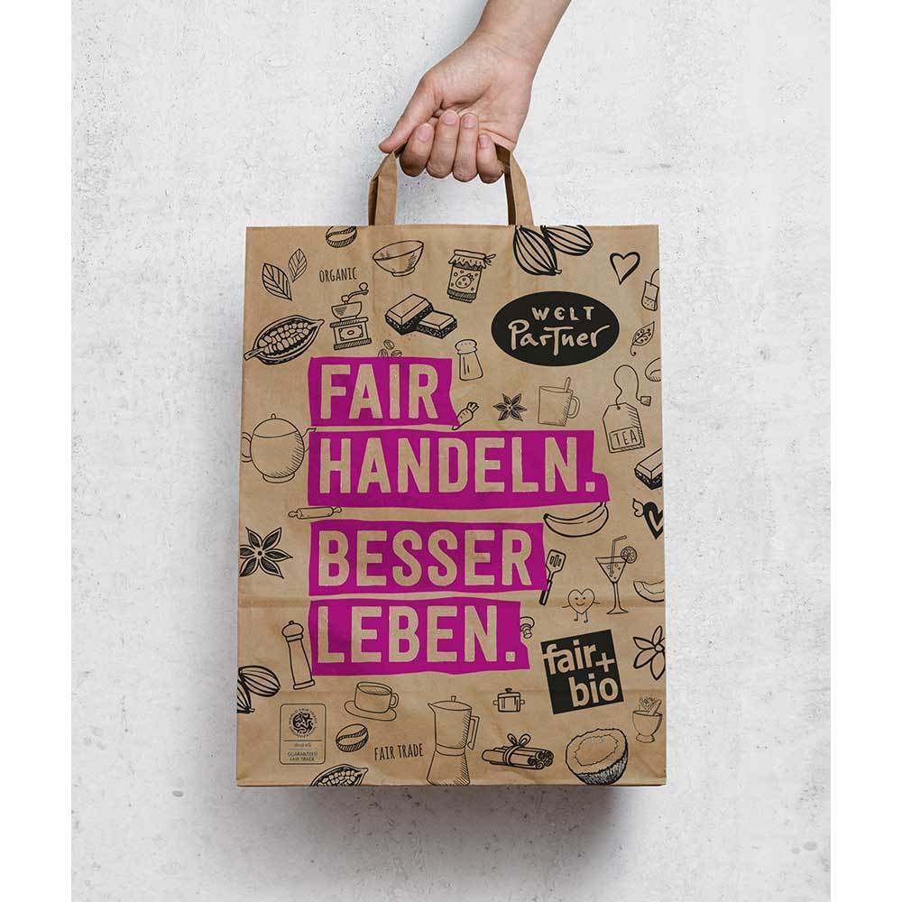 Papiertüte "FAIR HANDELN. BESSER LEBEN." recyceltes ungebleichtes kompostierbares Papier, CO²-neutral hergestellt, H28/B22/T14, 100 Stück/VE