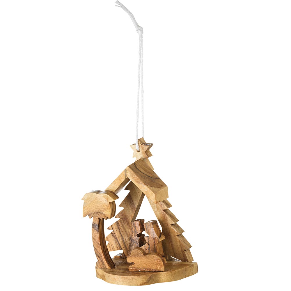 Anhänger "Krippe" aus Bethlehem/Palästina, Rückseite Weihnachtsbaum, halbrunder Standboden, Olivenholz, H8/B4