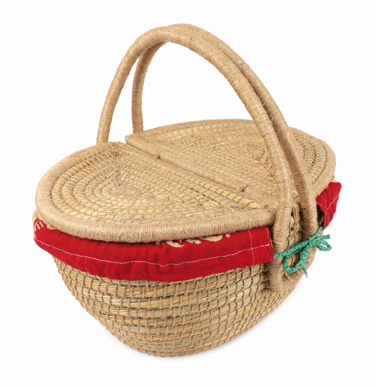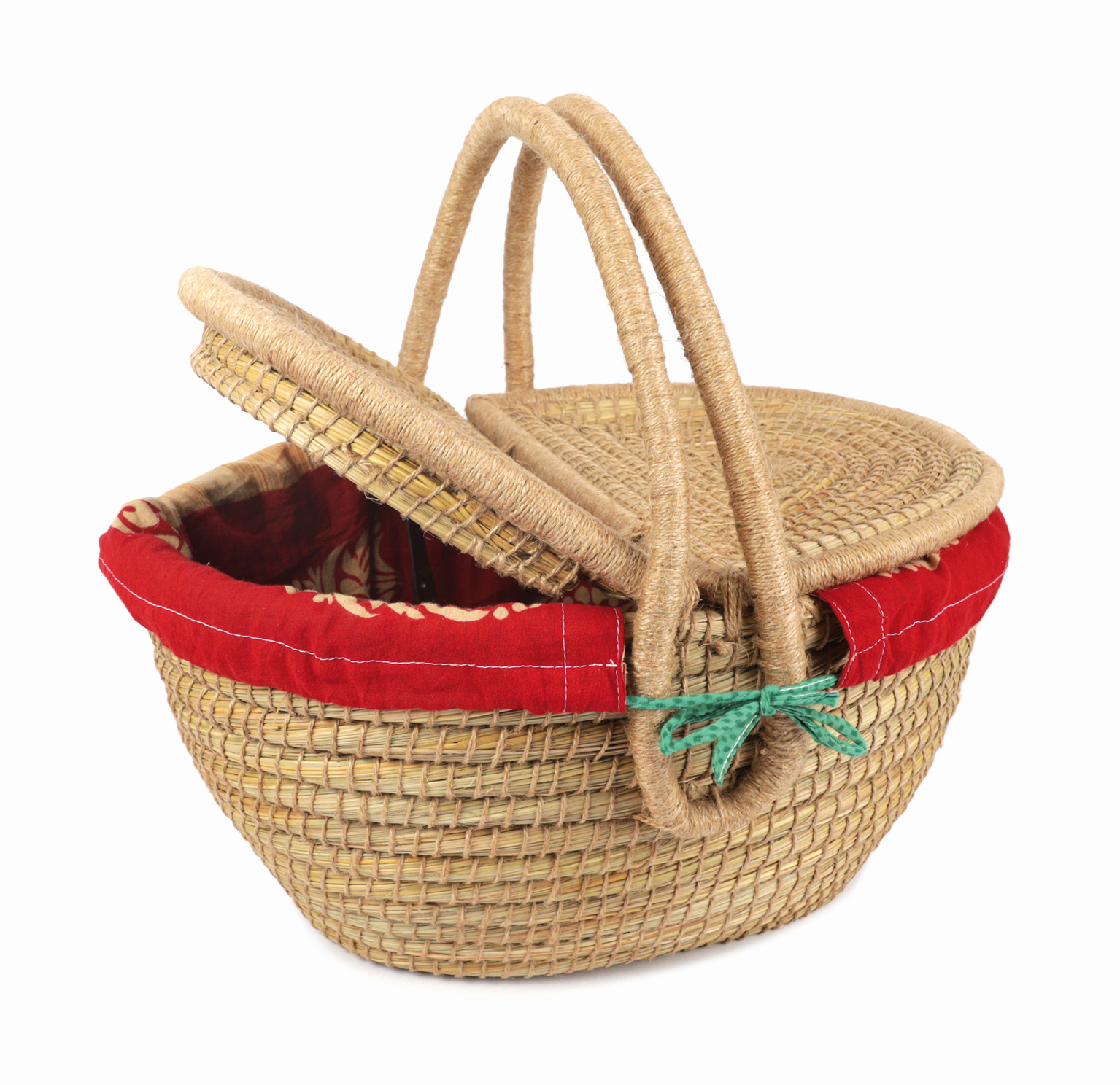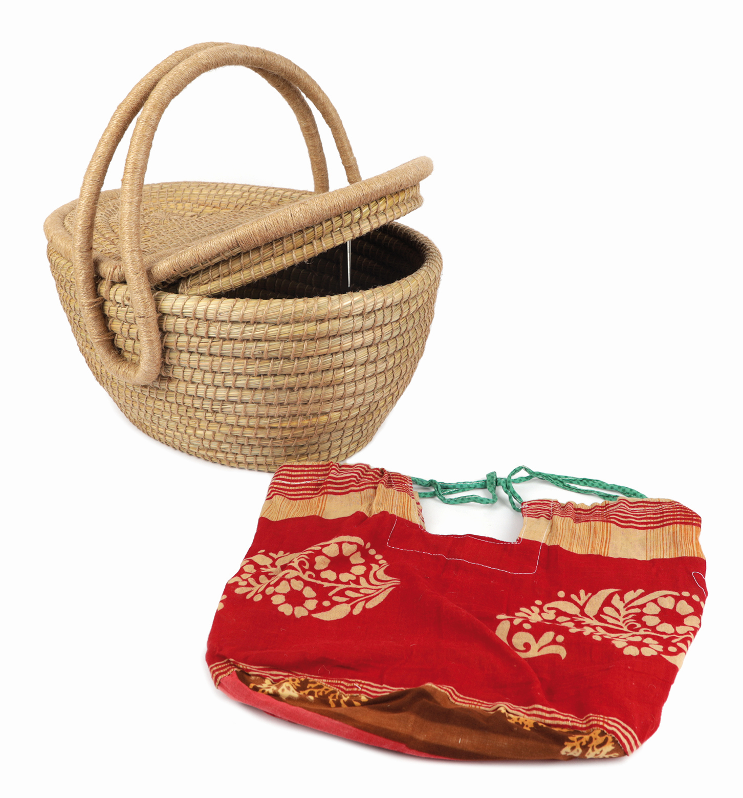 mit herausnehmbaren Textileinsatz, Kaisa-Gras, Jute und recycelter Sari-Stoff, 44 x 37 x 20 cm, H 41 cm mit Henkeln