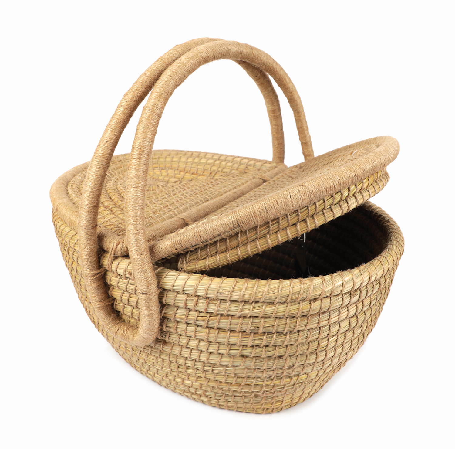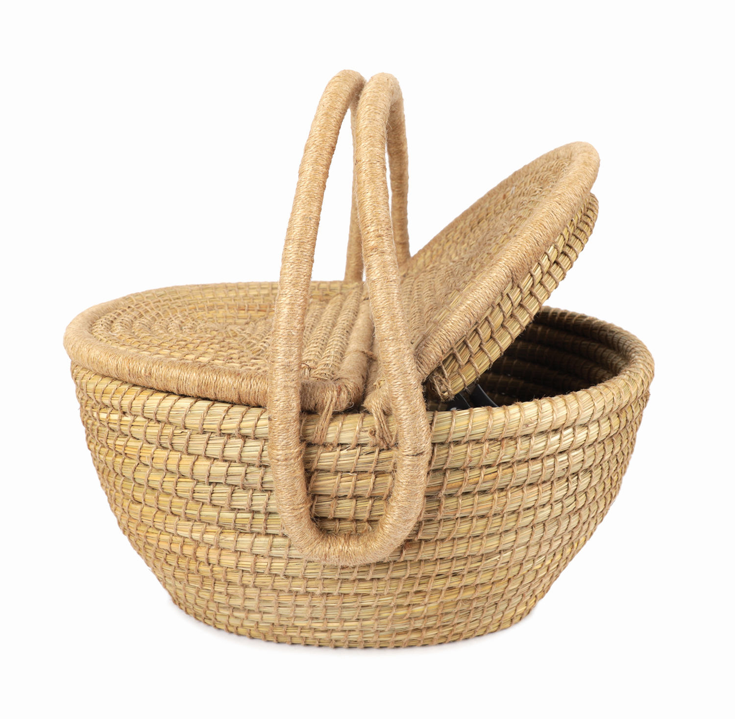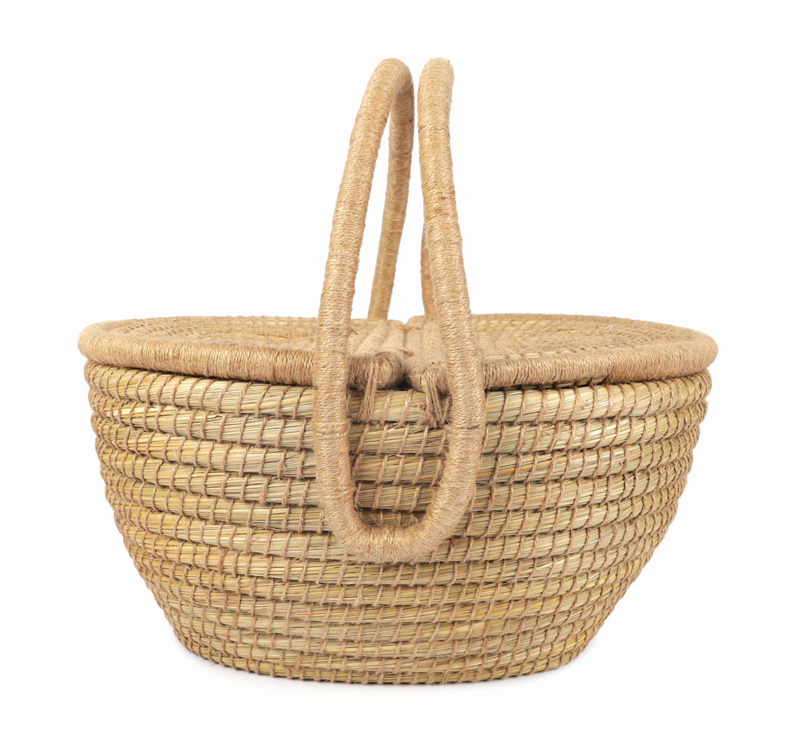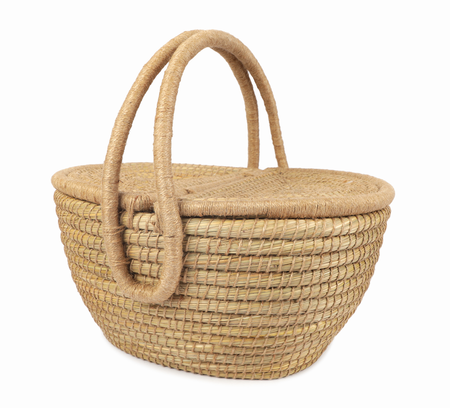 mit herausnehmbaren Textileinsatz, Kaisa-Gras, Jute und recycelter Sari-Stoff, 44 x 37 x 20 cm, H 41 cm mit Henkeln