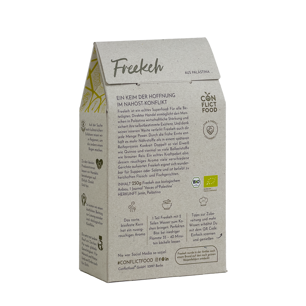 Bereits seit Jahrtausenden steht Freekeh in Palästina, Syrien und Jordanien fest auf dem Speiseplan. Da es so früh geerntet wird, enthält es mehr Nährstoffe als in einem späteren Reifeprozess. Es ist ein nährstoffreiches Lebensmittel, gut für die Gesundheit und das allgemeine Wohlbefinden. Manche bezeichnen es sogar also Superfood! Der Gesundheitsbooster ist in seinem Gehalt an Ballaststoffen einzigartig. Freekeh enthält doppelt so viele Ballaststoffe wie Quinoa und viermal so viel wie brauner Reis. Das köstliche Korn mit dem nussig-rauchigen Aroma eignet sich wunderbar für Suppen oder Salate und ist beliebt zu Fleisch- und Fischgerichten.