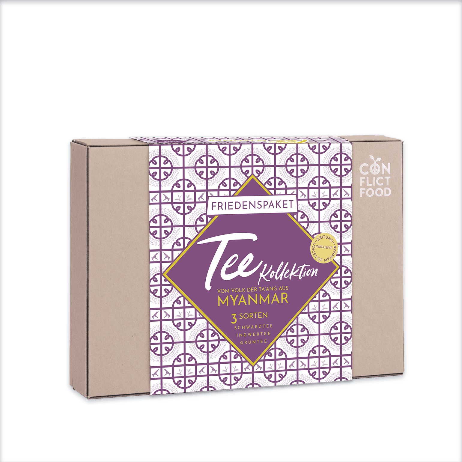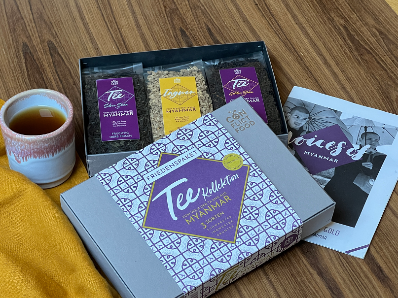 Conflictfood: Tee-Kollektion vom Volk der Ta'ang aus Myanmar. 50 g Schwarztee "Golden Shan", lose, 50 g Grüntee "Silver Shan", lose, 75 g Ingwer, lose, gewürfelt und getrocknet, in hochwertiger Geschenkbox,, inklusive Journal "Voices of Myanmar" und zwei Infokarten