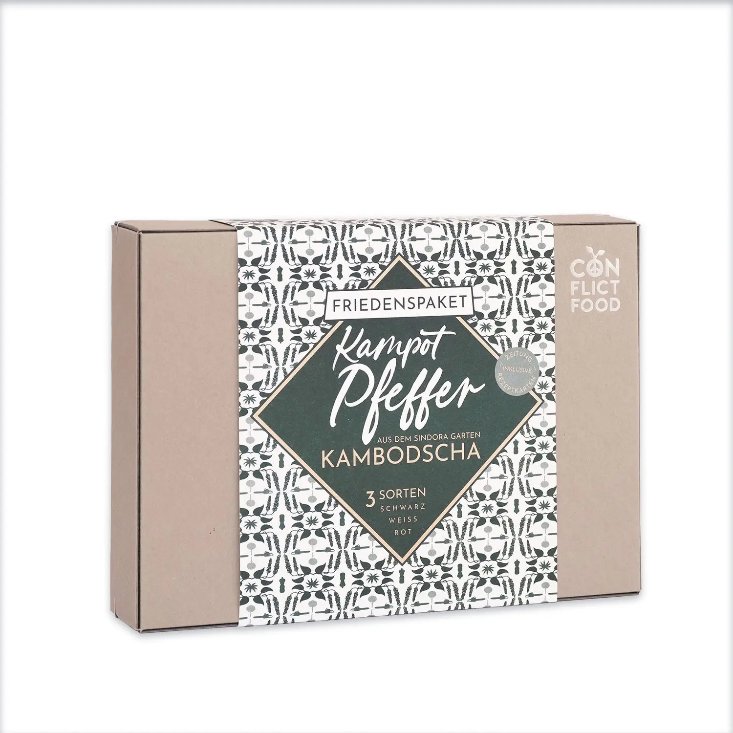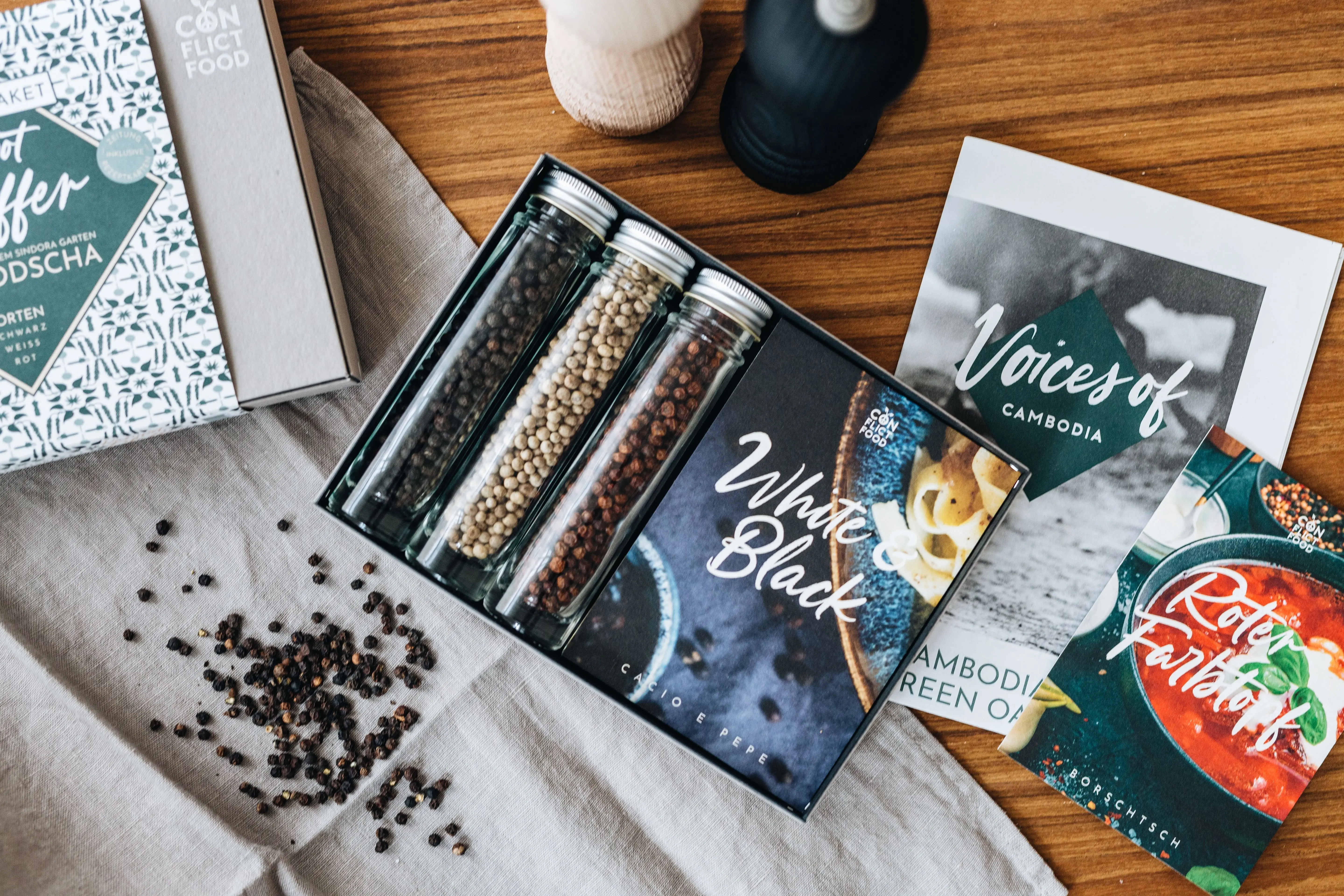 Conflictfood: Pfeffer aus dem Sindora-Garten, schwarz, rot und weiß,, in hochwertiger Geschenkbox, inklusive Journal "Voices of Cambodia" und Rezeptkarten, 3 x 33 g