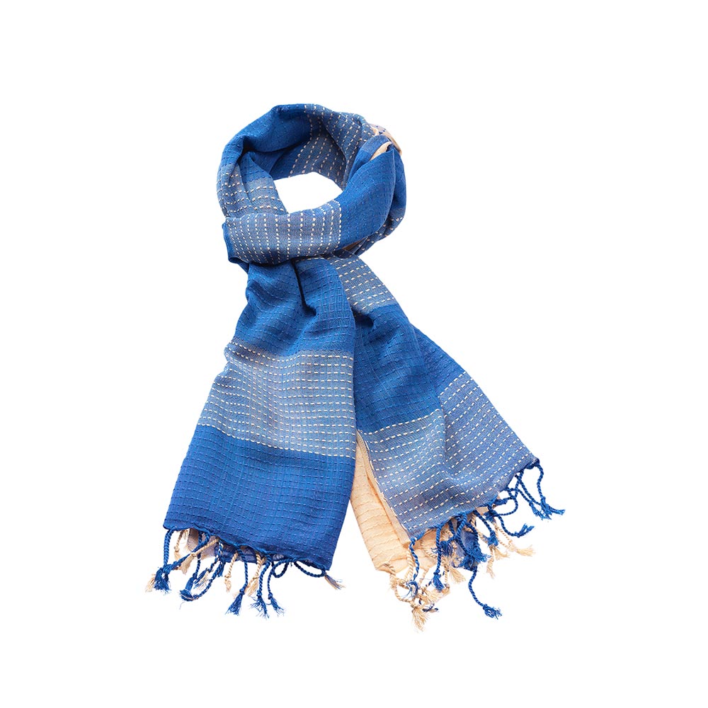Schal, handgewebt, Blockmuster in blau/beige, Kantha-Stickerei, mit Fransen, Bio-Baumwolle, 180x70