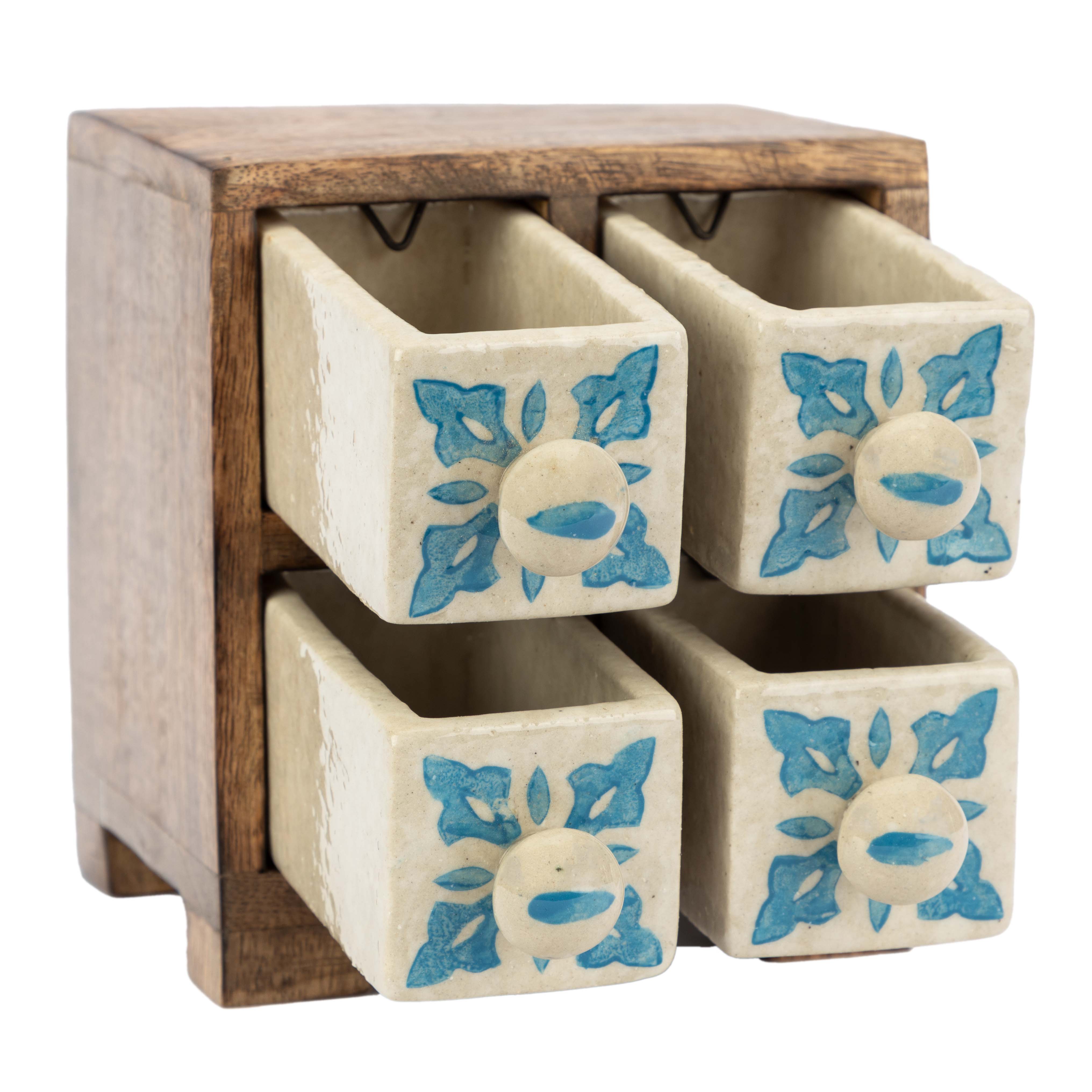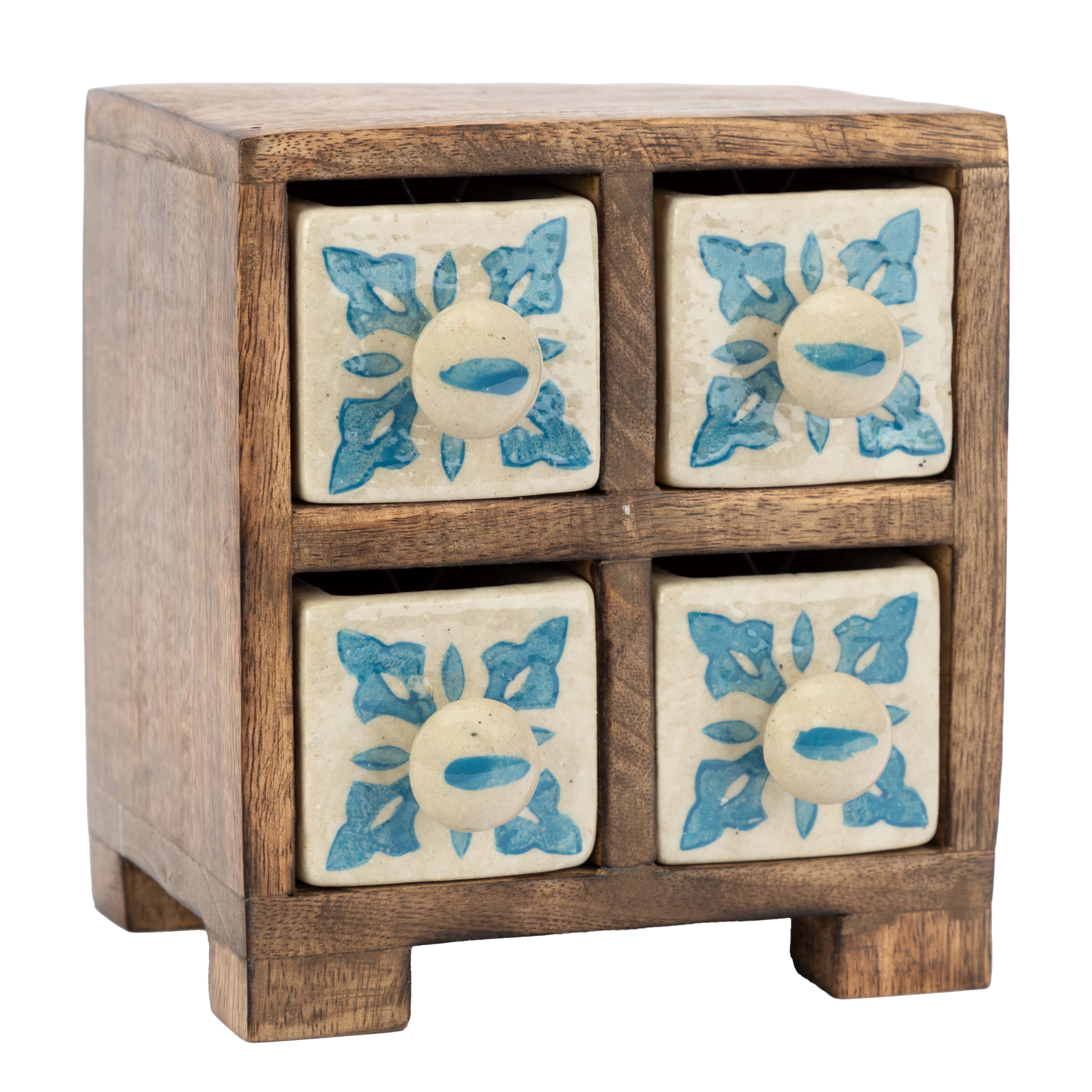 Mango-Holz, Keramik, 4 Schubladen, braun/weiß/türkis, 15 x 15 x 10 cm
