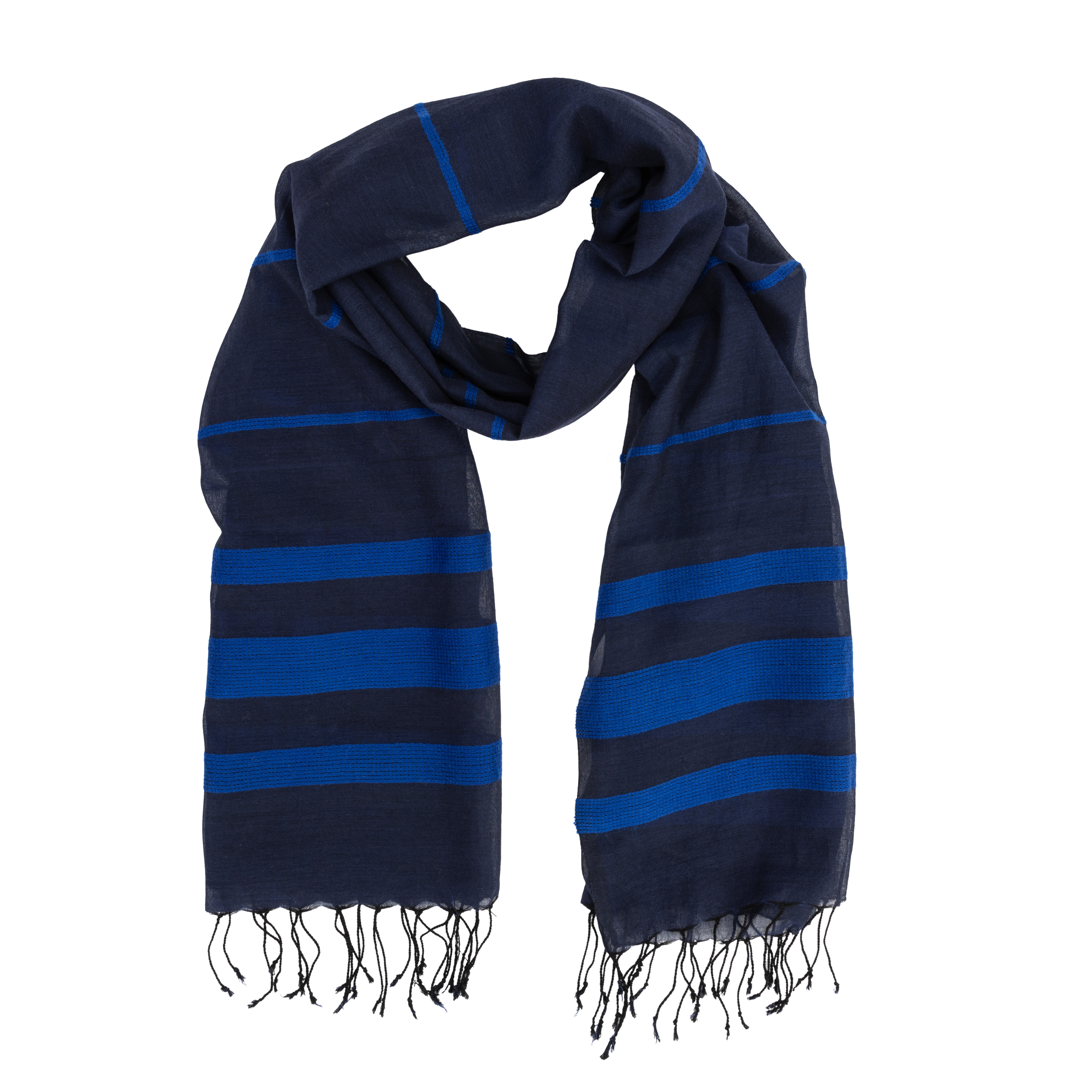 80% Baumwolle, 20% Merinowolle, handgewebt und -bedruckt, mit Fransen, blau/schwarz, 70 x 180 cm