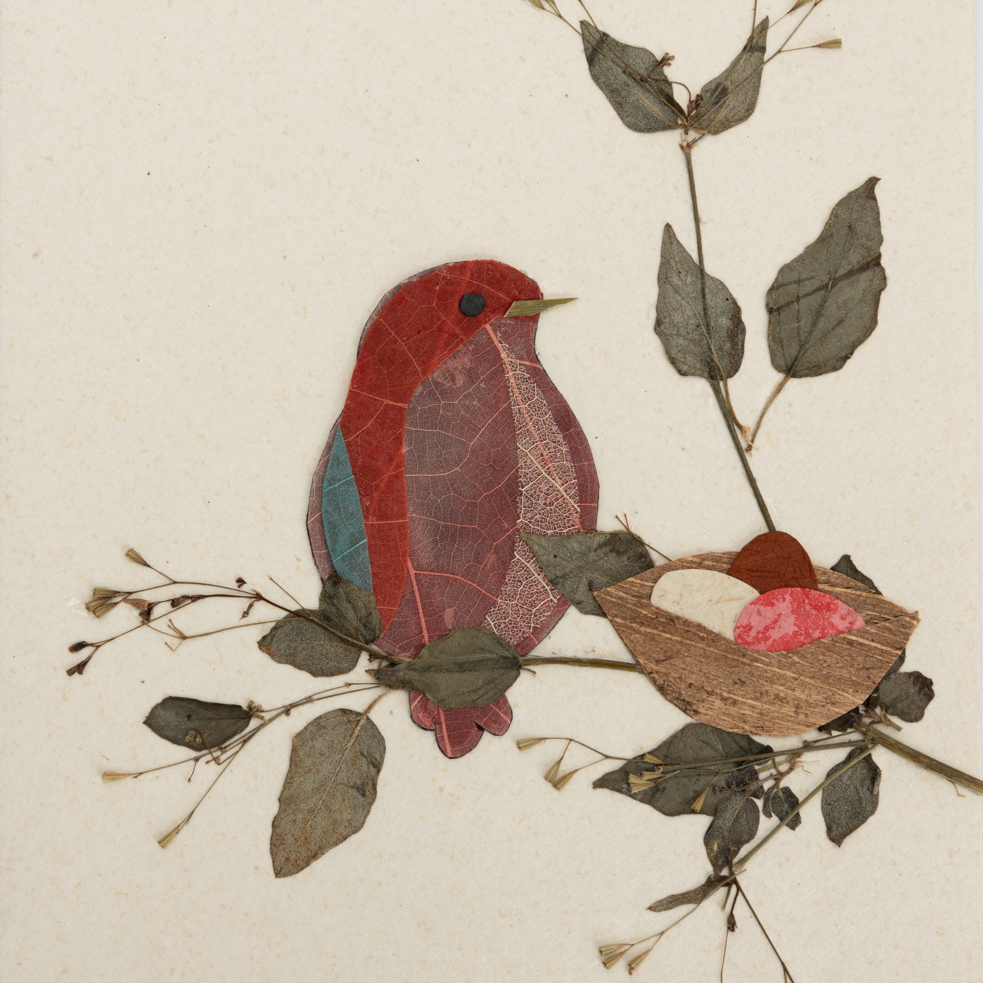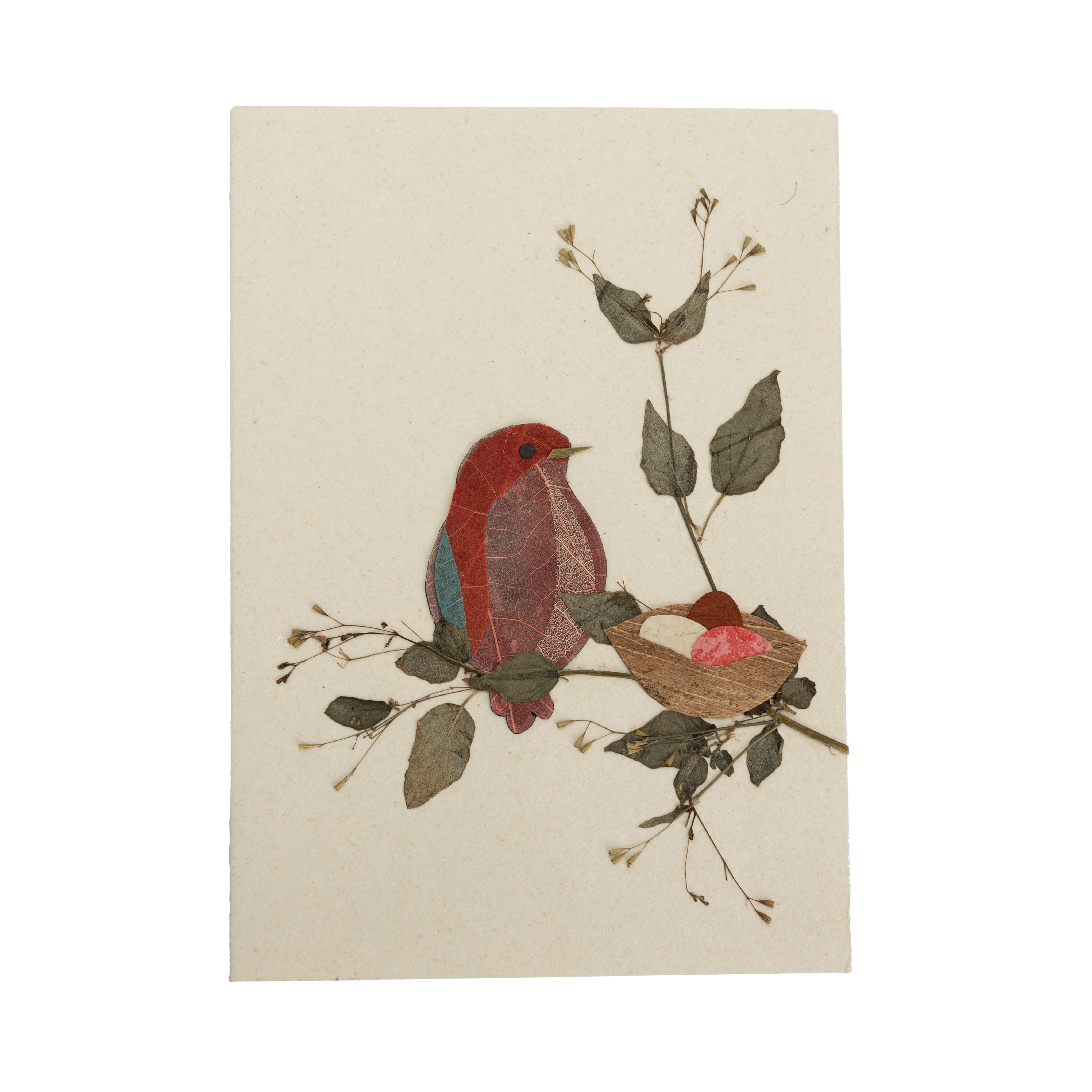 handgeschöpftes Papier, mit Blüten-Applikationen, Doppelkarte mit Umschlag, natur/grün/rot, 12 x 17 cm