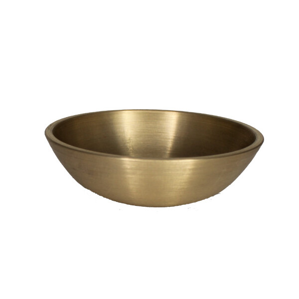 Gegossene Klangschale aus Bronze in flacher Form, mit matter Oberfläche. Ein passender Klöppel wird mitgeliefert.