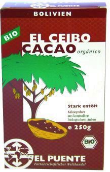 Dieses reine Bio-Kakao-Pulver wird von unserem Partner El Ceibo in Bolivien hergestellt. Die Kakaobohnen werden schonend geröstet und anschließend gepresst, um das Kakaopulver zu erhalten. El Ceibo verzichtet auf die Alkalisierung der Bohnen, ein Vorgang der sonst häufig vorgenommen wird, um dem Pulver eine dunklere Farbe zu verleihen. Da der Fettgehalt des fertigen Pulvers unter 20% liegt, gilt es als stark entöltes Kakaopulver. Es eignet sich gut für die Zubereitung von warmer Trinkschokolade und zum Backen.