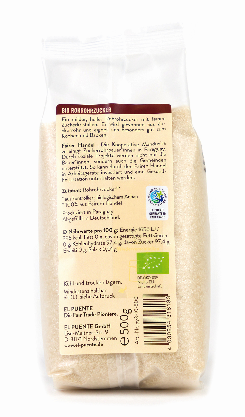 Ein milder, heller Rohrzucker mit feinen Zuckerkristallen. Dieser Zucker wird bei der Herstellung nicht raffiniert, sondern durch die Zugabe von Zuckerkristallen zur Kristallisation angeregt. Das Zuckerrohr wird von der Kleinbauernkooperative Manduvira angebaut und in einer eigenen Verarbeitungsanlage in Paraguay zu Zucker verarbeitet.