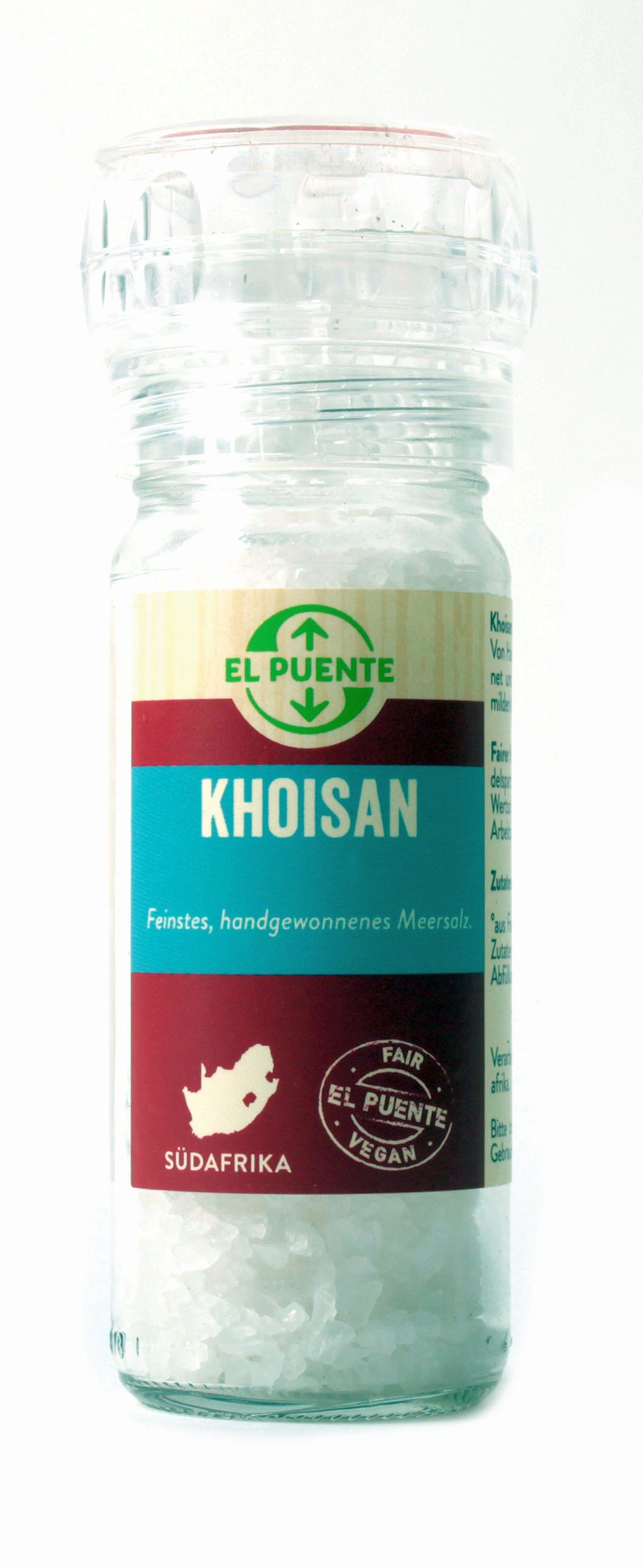 Dort wo Atlantik und indischer Ozean zusammentreffen, wird das Meersalz von Khoisan gewonnen. Gut dosierbar in der praktischen Mühle