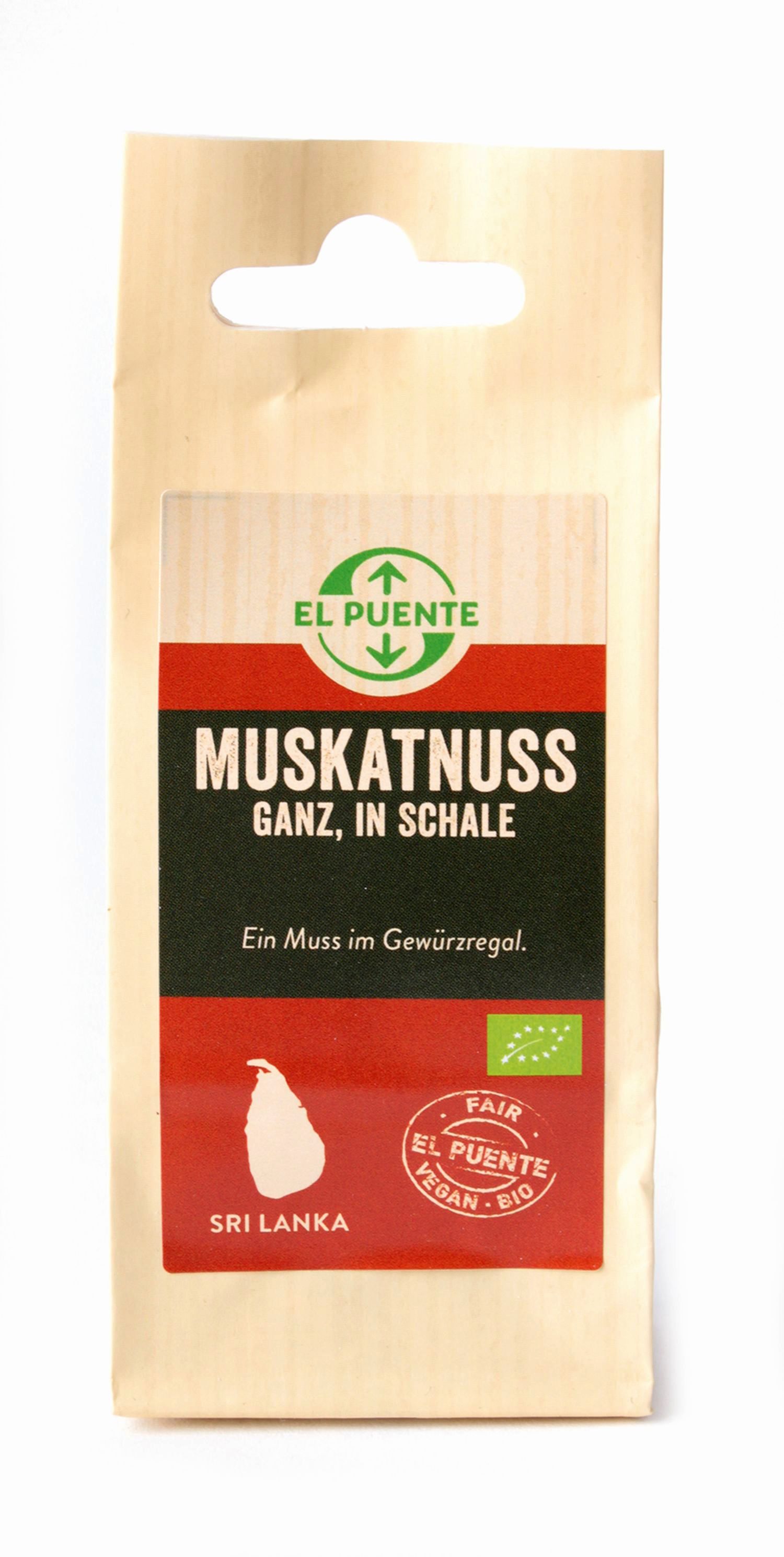 Die aromatische Muskatnuss eignet sich zum Verfeinern vieler Speisen. Unsere Bio-Muskatnüsse werden von den Kleinbauern der Organisation Podie in Sri Lanka angebaut. Wir liefern sie in ihrer natürlichen Schale, so dass diese vor der Verwendung erst geknackt werden sollte.