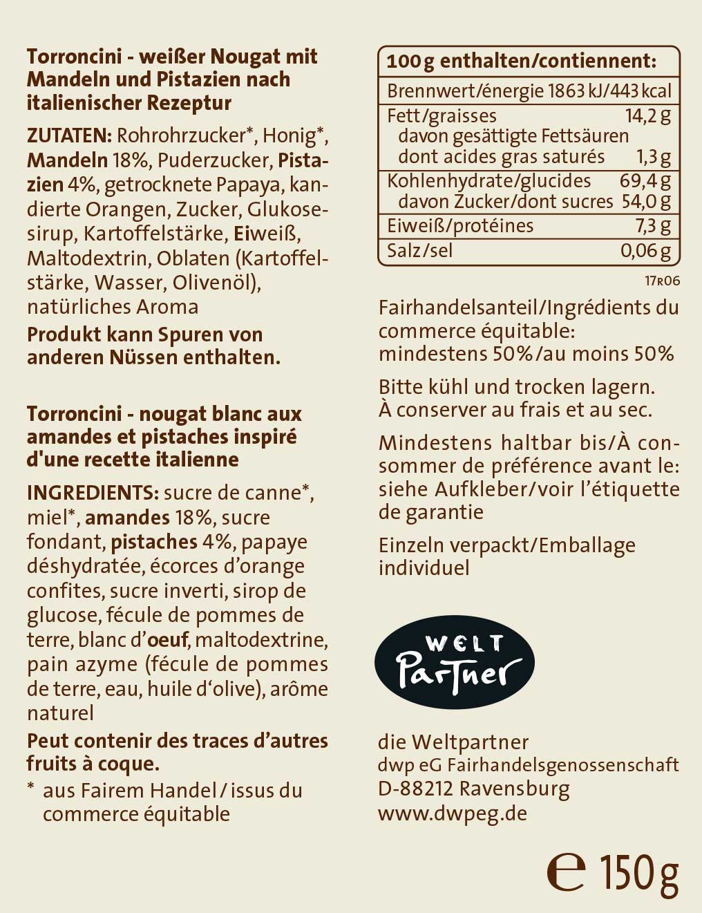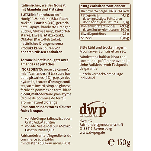 Rohrohrzucker*, Honig*, Mandeln 18%, Puderzucker, Pistazien 4%, getrocknete Papaya, kandierte Orangen, Zucker, Glukosesirup, Kartoffelstärke, Eiweiß, Malzextrakt, Oblaten (Kartoffelstärke),