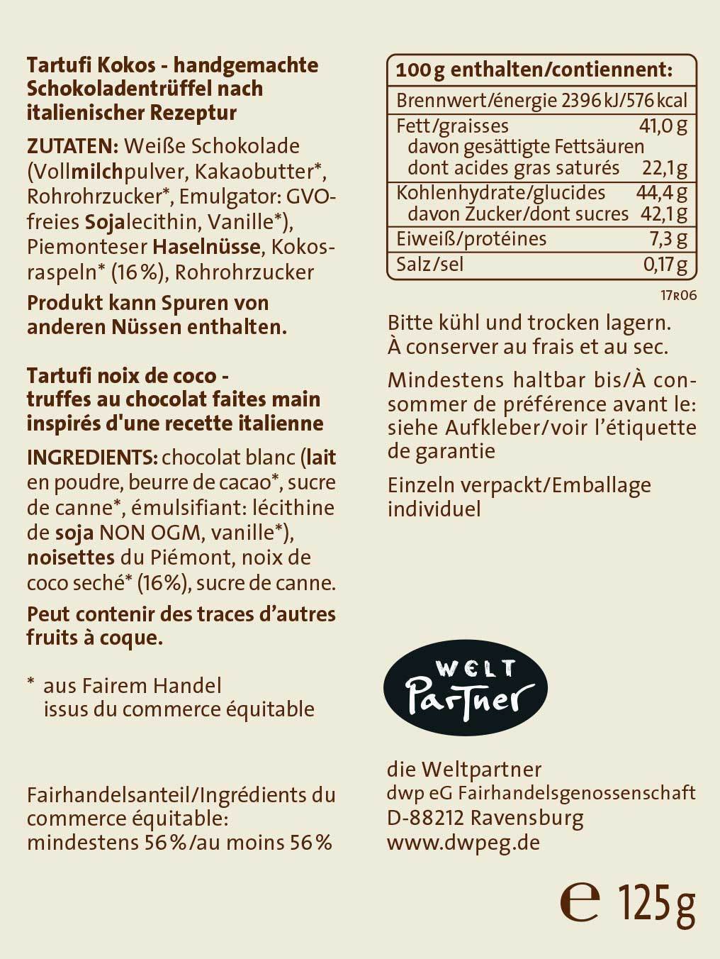 Weiße Schokolade (Vollmilchpulver, Kakaobutter*, Rohrohrzucker*, Emulgator: GVO-freies Sojalecithin, Vanille*), Piemonteser Haselnüsse, Kokosraspeln* (16%), Rohrohrzucker