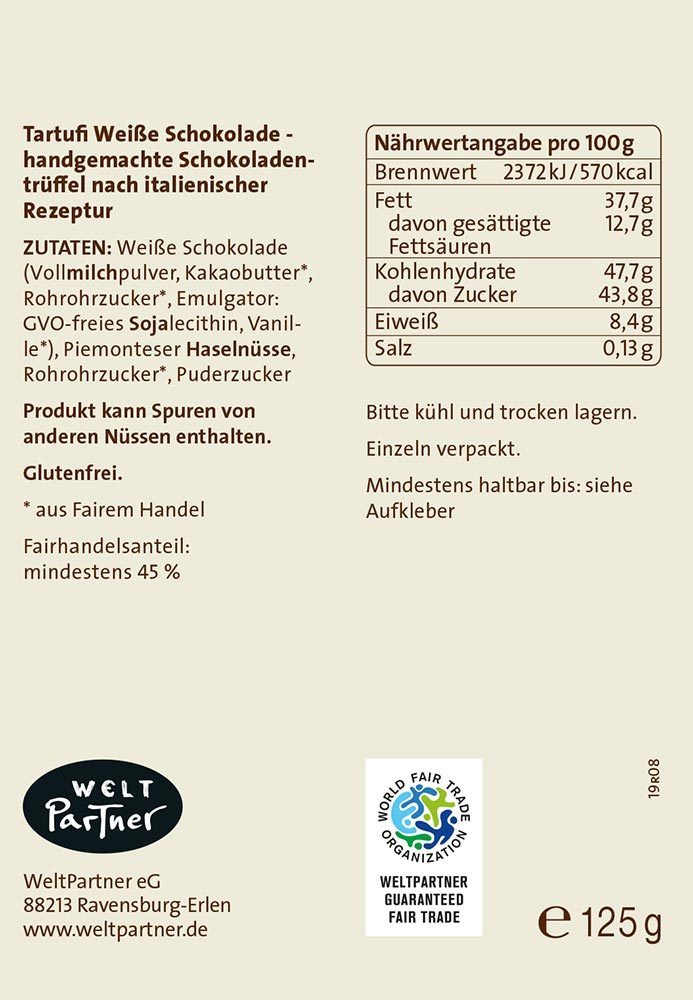 Weiße Schokolade (Vollmilchpulver, Kakaobutter*, Rohrohrzucker*, Emulgator: GVOfreies Sojalecithin, Vanille*), Piemonteser Haselnüsse, Rohrohrzucker*, Puderzucker