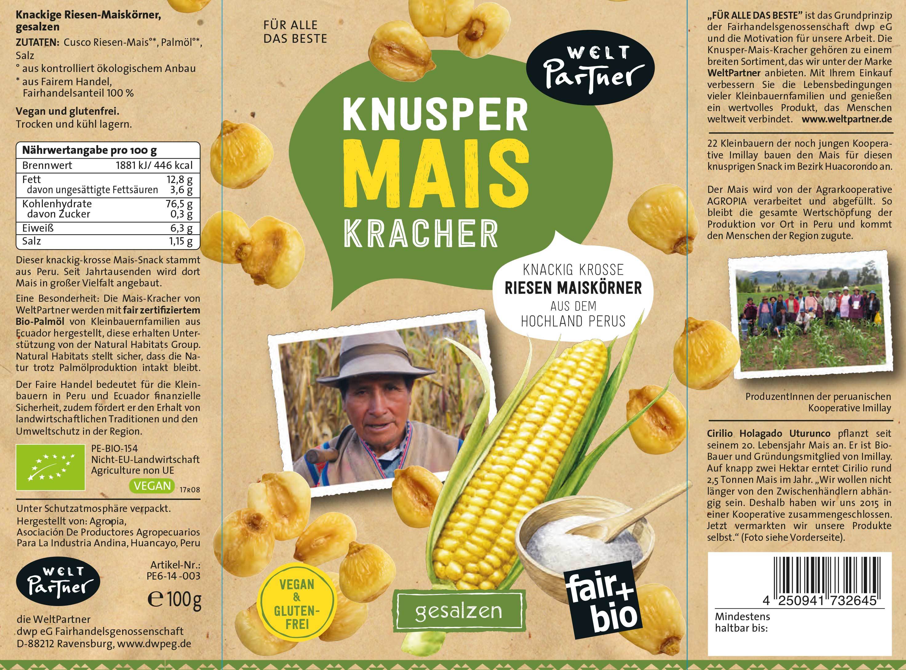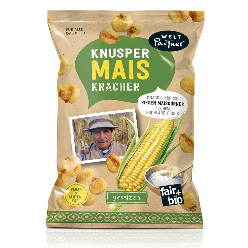 Die knusprigen Mais Kracher von WeltPartner werden aus der bekannten Sorte „Cusco Riesenmais“ hergestellt.