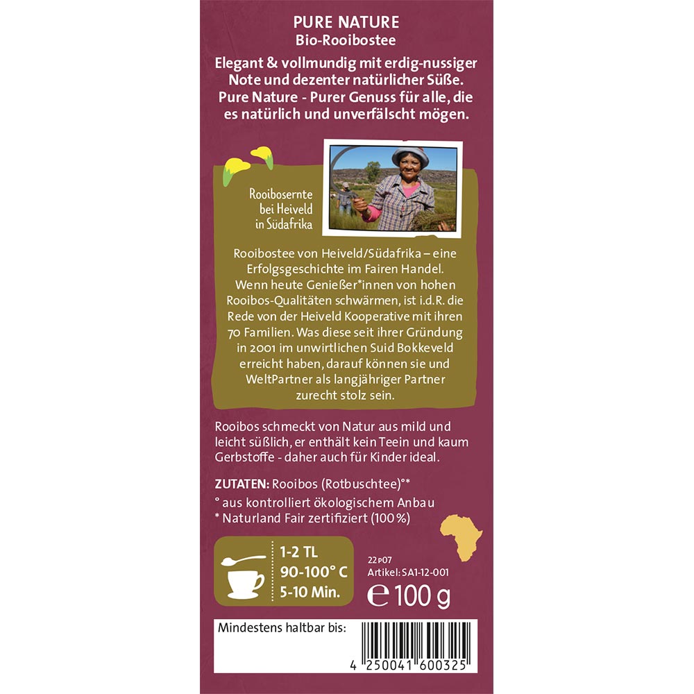 Der edle Bio-Rooibos der Heiveld-Kooperative im Sud Bokkeveld hat sich in den vergangenen Jahren weltweit zum Synonym für Spitzenqualität etabliert. Darauf können die 64 Mitgliedsfamilien, die ihren Tee traditionell von Hand auf ihren kleinen Flächen kultivieren und ernten, zu Recht stolz sein.