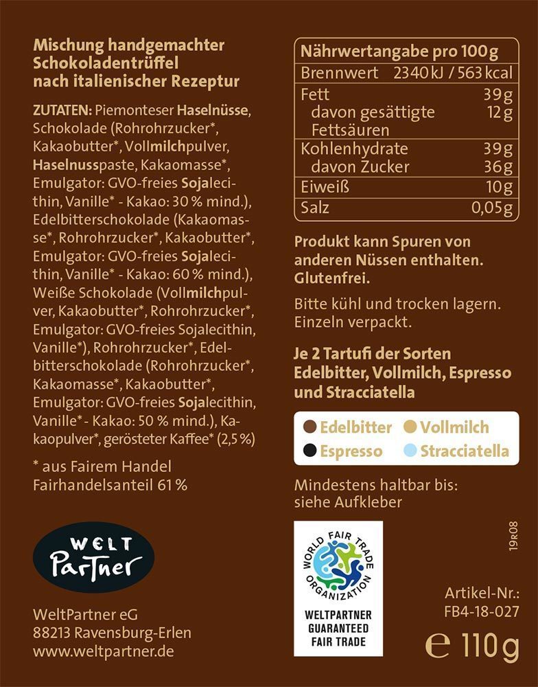 Piemonteser Haselnüsse, Schokolade (Rohrohrzucker*, Kakaobutter*, Vollmilchpulver, Haselnusspaste, Kakaomasse*, Emulgator: GVO-freies Sojalecithin, Vanille* - Kakao: 30 % mind.), Edelbitterschokolade (Kakaomasse*, Rohrohrzucker*, Kakaobutter*, Emulgator: GVO-freies Sojalecithin, Vanille* - Kakao: 60 % mind.), Weiße Schokolade (Vollmilchpulver, Kakaobutter*, Rohrohrzucker*, Emulgator: GVO-freies Sojalecithin, Vanille*), Rohrohrzucker*, Edelbitterschokolade (Rohrohrzucker*, Kakaomasse*, Kakaobutter*, Emulgator: GVO-freies Sojalecithin, Vanille* - Kakao: 50 % mind.), Kakaopulver*, gerösteter Kaffee* (2,5 %)